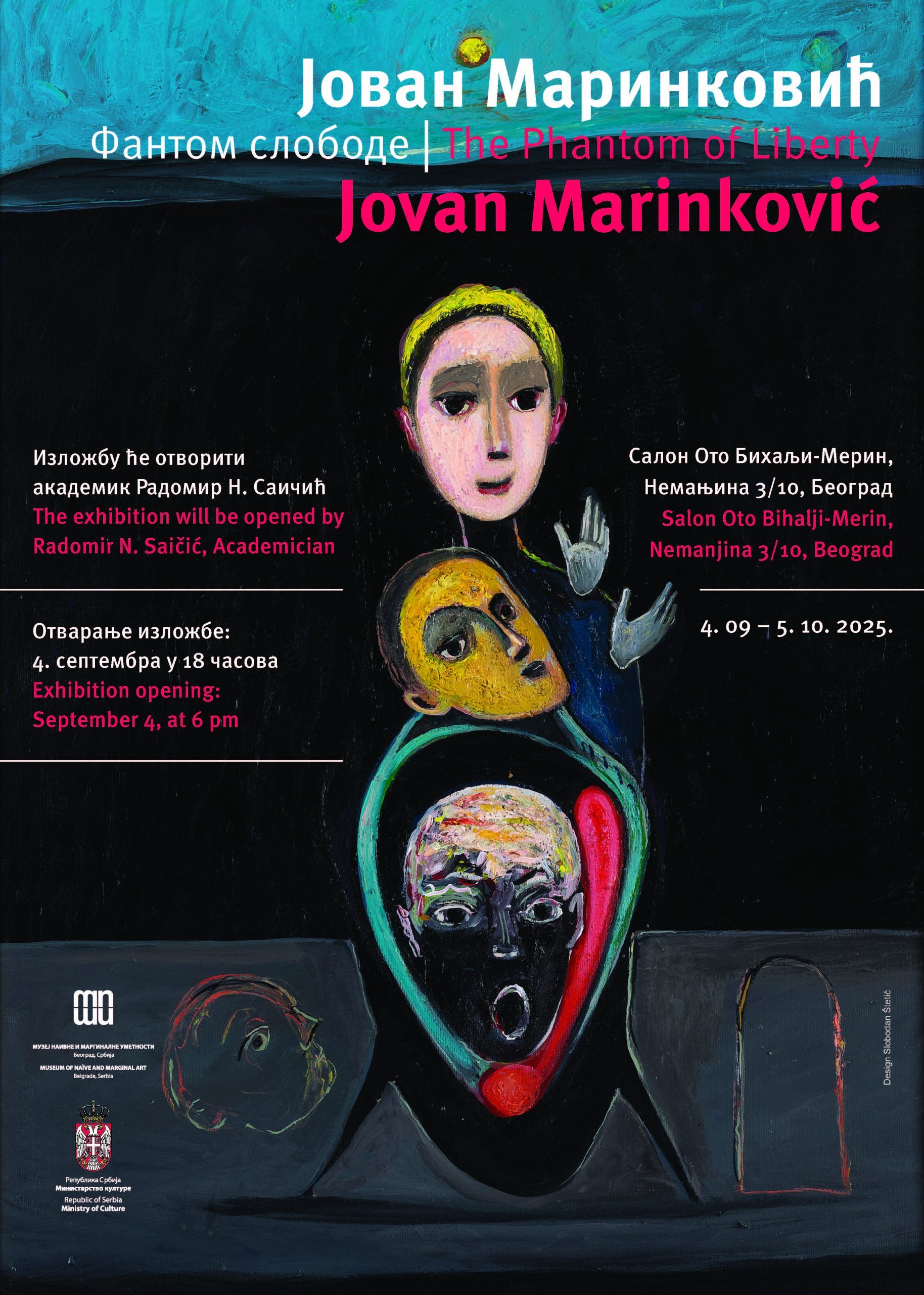 Прва самостална изложба уметника Јована Маринковића Фантом слободе, после приказивања у Галерији Музеја наивне и маргиналне уметности у Јагодини, сели се у Салон Ото Бихаљи-Мерин у Београду. На изложби ће бити изложена 21 слика и 9 цртежа.